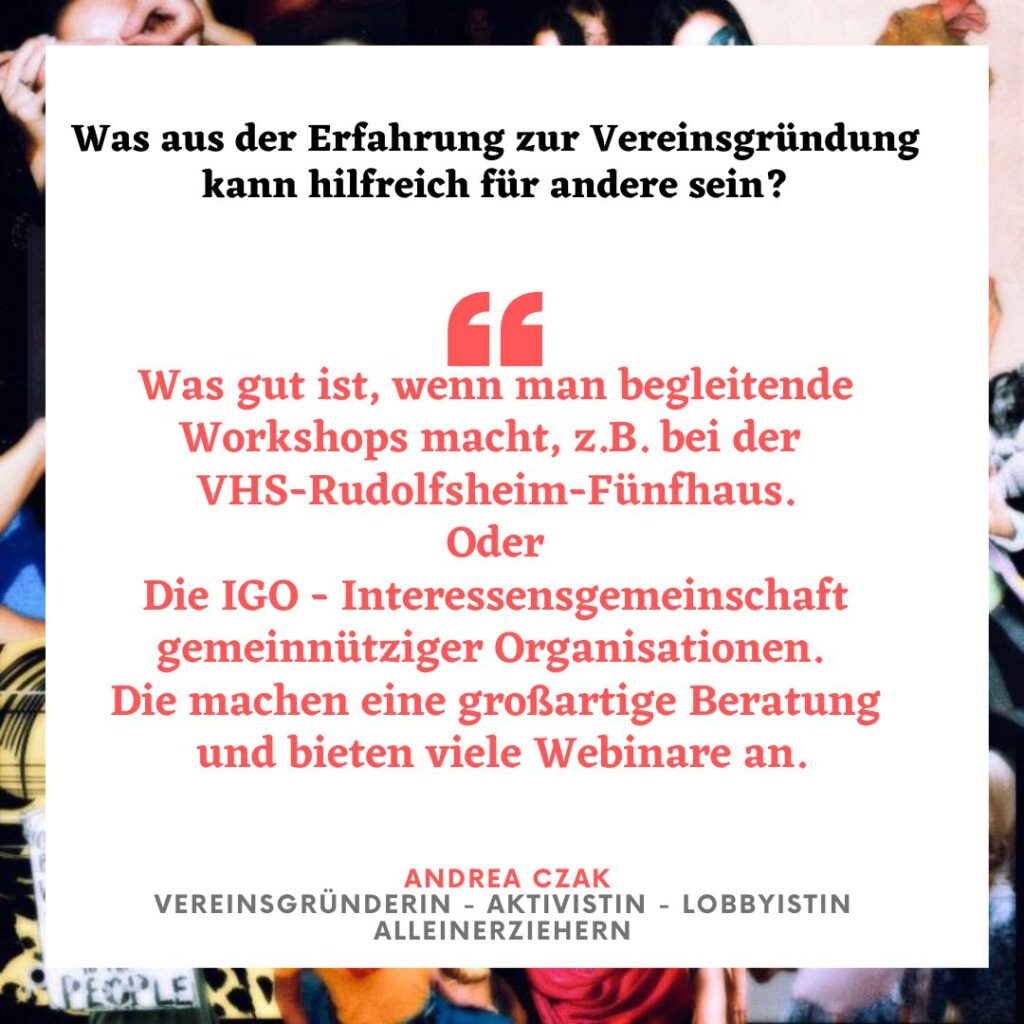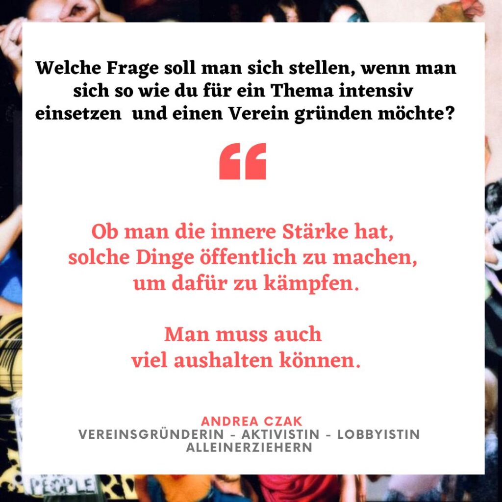 Andrea Czak: „Der Fokus liegt auf Unterhaltsverfahren, parallel haben sich dazu auch die Themen Obsorge und Pflegschaftsverfahren aufgetan“. Außerdem ist der Verein auch eine Lobbyorganisation die an die Politik Forderungen stellt. Wie z.B. beim neuen Kindschaftsrecht, das geplant ist. Czak: „Wir wollen keine geteilte elterliche Verantwortung. Wir fordern das Richter_innen Fortbildung für psychische Gewalt bekommen und sich mehr mit der Bindungstheorie auseinandersetzen. Die Kraft für ihr Tun schöpft Andrea nach eigenen Worten, aus dem Kampf gegen das Patriarchat, dem Austausch mit anderen Frauen und dass sie andere Mütter beraten kann, damit diese erfolgreich auftreten können und damit sie empowert sind.“