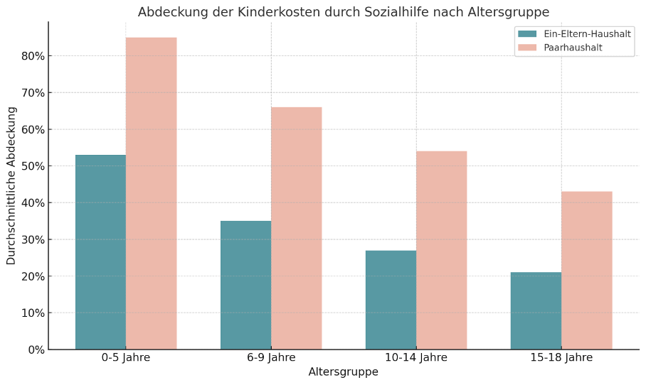 - Die prozentuell gleiche Abdeckung der Kinderkosten durch die Sozialhilfe, unabhängig davon, ob ein Kind in einem Ein-Eltern- oder Paarhaushalt lebt!