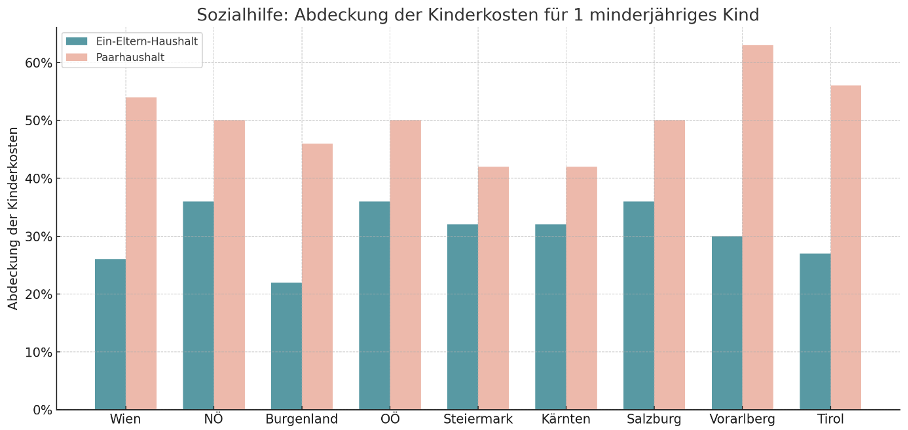 Am krassesten zeigt sich die Ungleichbehandlung im Burgenland: Ein*e Alleinerzieher*in mit einem Kind bekommt dort durch die Sozialhilfe maximal 22 % der Kinderkosten ersetzt. In einem Paarhaushalt mit Kind sind es 46 %. In Wien liegt die Abdeckung bei Alleinerzieherinnen bei 26 %, bei Paarhaushalten bei 54 %.